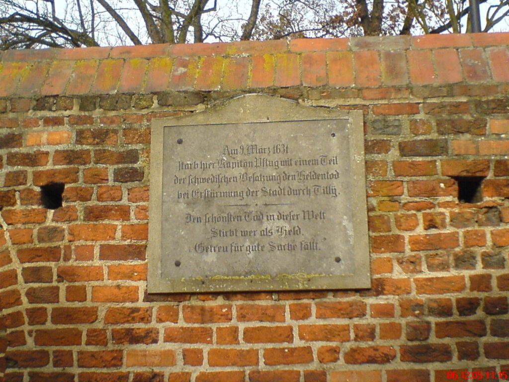 ich weiß jetzt momentan keinen besseren Faden. Ich habe letztens mal wieder etwas entdeckt was man sonst gerne im Vorbeigehen ignoriert. Daraufhin schnell mein Mobiltelefon gezückt und ein Photo gemacht. ![]() Den schönsten Tod in dieser Welt Stirbt wer als Held Getreu für gute Sache fällt 1627 Wallensteins Truppen besetzen die Stadt 1631 1.Februar Schweden zwingen kaiserliche Truppen zum Abzug 9.März fürchterliches Blutbad durch Tillys Landsknechte im 30 jährigen Krieg, wirtschaftlicher Ruin der Stadt Klick |